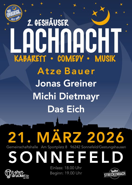 Am Samstag, den 21.03.2026 um 20:00 Uhr startet die Geshäuser Lachnacht in die zweite Runde – und das Line-Up könnte entspannter, musikalischer und witziger kaum sein! Am 21. März 2026 verwandelt sich die Gemeinschaftshalle erneut in den fränkischen Hotspot für Humor, Musik und gute Laune.